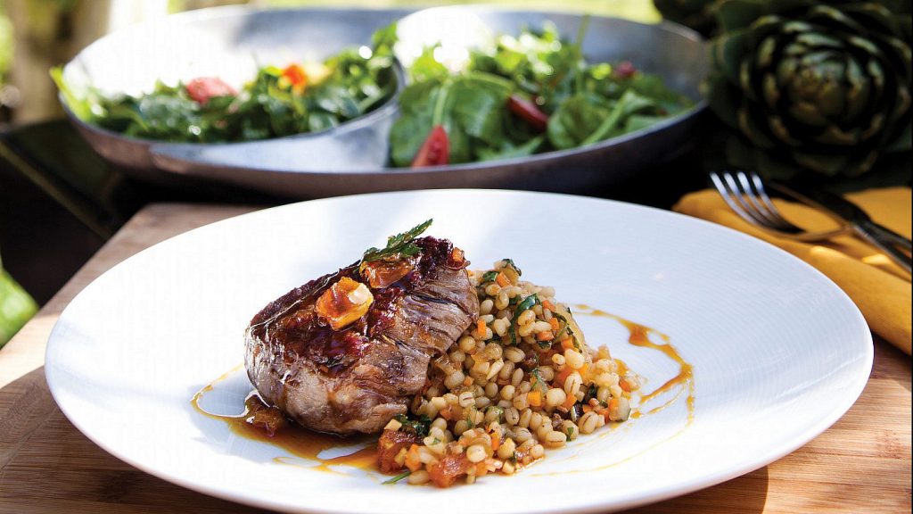 מחממים מעט את רוטב התפוחים. מניחים מתבשיל הגריסים במרכז הצלחת, מניחים מעל את הפילה ויוצקים רוטב מעל ומסביב.