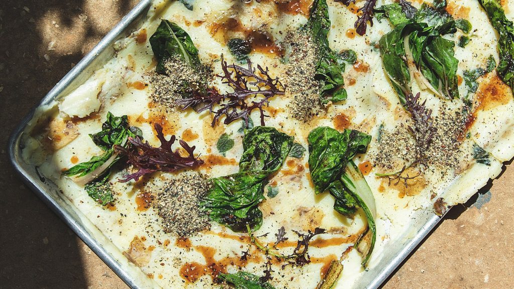 במהלך ההכנה משטחים את תפוחי האדמה לעובי דק ועלי המנגולד החרוכים מעניקים לה טעם מעושן